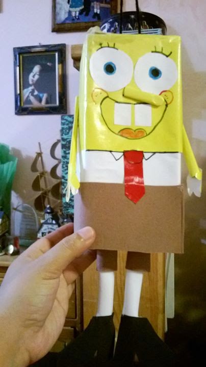Esta hecha con un simple tetrabrick, forrada con papel y pintando con plumón los detalles, los pies están hechos con fomi.