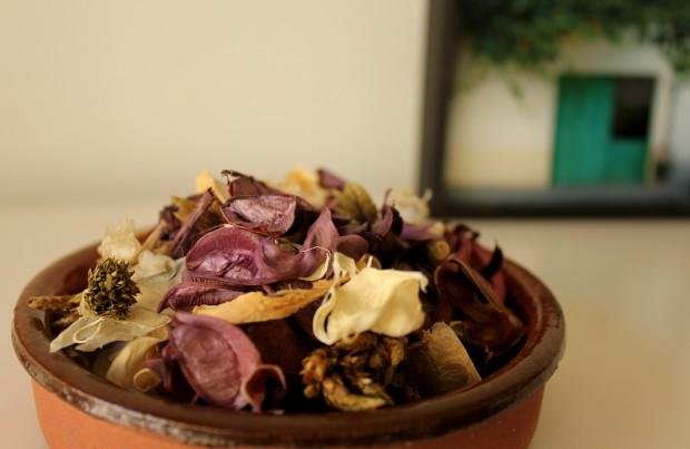 En esta idea tenemos dos partes, el cuenco, que puedes hacer de mil formas diferentes (para ello mejor dedicamos otro post) o utilizar algún cuenco o plato que tengas en casa, y el popurrí aromático. Los popurrí aromáticos suelen ser pétalos y hojas que aún conservan el olor, con especias (estrellas de anís, canela…), lo puedes hacer tú mismo (sobre todo en época primaveral) o conseguir alguno de los que venden preparados, suelen ser mucho más duraderos y los puedes utilizar durante todo el año. Algunos aromas frecuentes son frutos rojos, lavanda o naranja y canela.