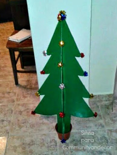 5. Nuestra amiga Silvia, nos manda el árbol que hizo para las Navidades del año pasado. Un árbol hecho con cartón silueteado y pintado con spray verde y al que le acompañan unos adornos clásicos de Navidad.