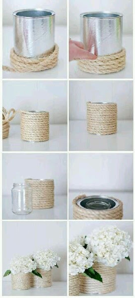 Esto si que es fácil, pero de verdad y el resultado, no me puede gustar más. Lo único que tienes que hacer es pegar con cola una cuerda por todo el alrededor de tu lata y listo, un bonito macetero o jarrón en un momento.