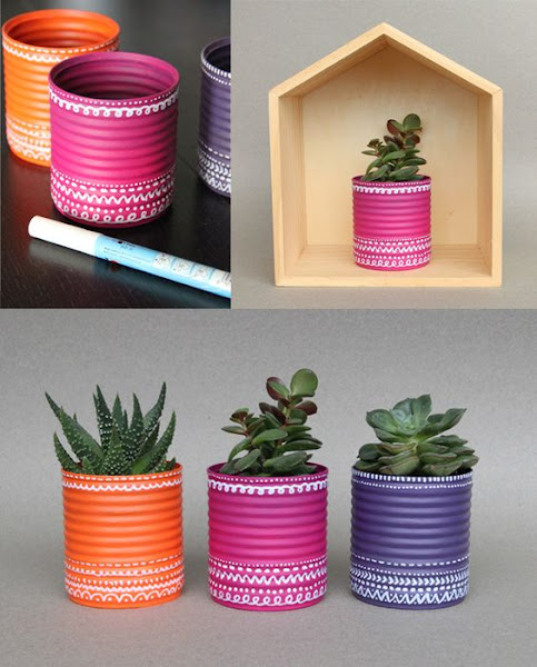Estos maceteros también quedan muy bonitos y los puedes hacer en un momento. Pinta tu lata con chalk paint, bien en spray o con un pincel. Deja secar la pintura y para terminar con un rotulador permanente de color blanco o cualquier otro que te guste, pinta pequeños detalles en tus maceteros.