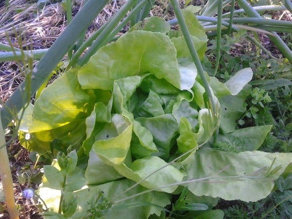 Cultivamos las lechugas entre las cebollas por varias razones, entre ellas el ahorro de espacio, de agua y porque son dos cultivos que no se perjudican el uno al otro con unos intervalos de recogida muy diferentes.