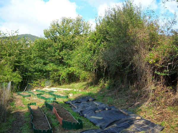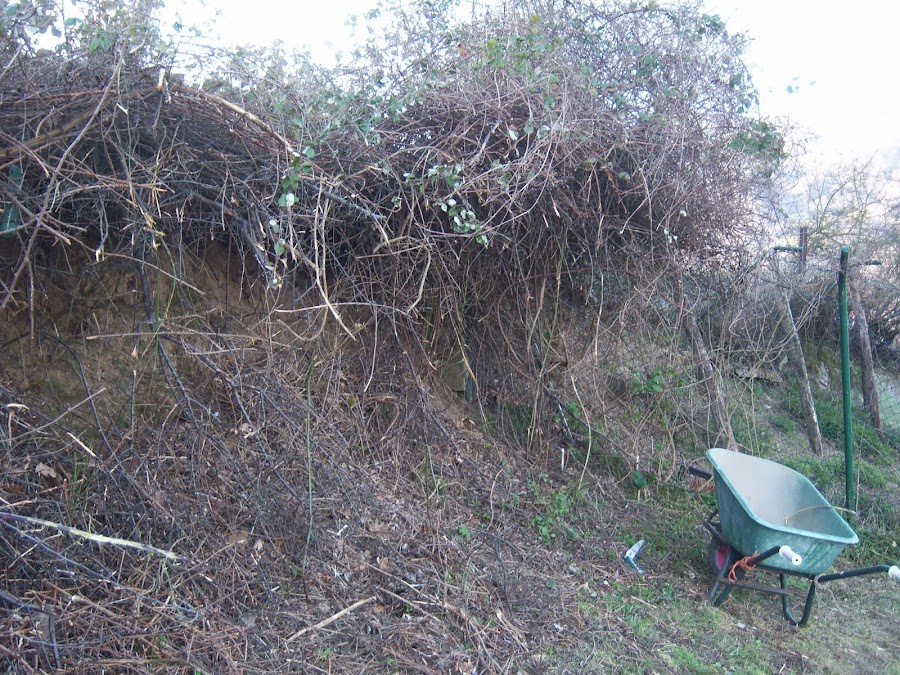 Para limitar los bancales utilizamos los materiales de los que disponíamos en esos momentos: persianas, maderas y unos separadores de jardín que estaban en la finca que nos han venido estupendamente.