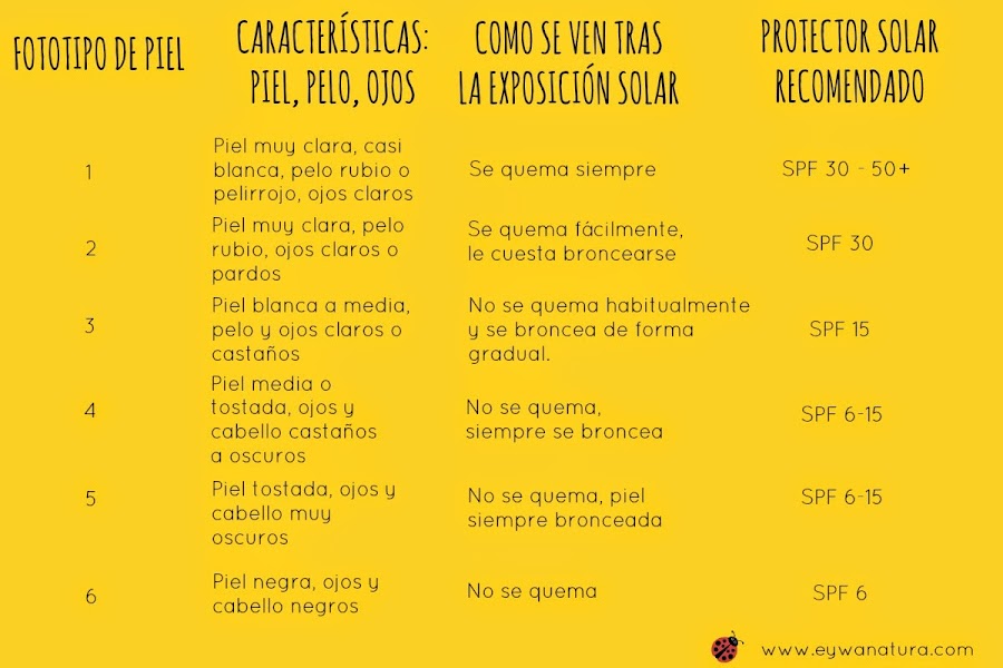 Tabla de Fototipo cutáneo para elegir el protector solar más adecuado para nuestro tipo de piel.