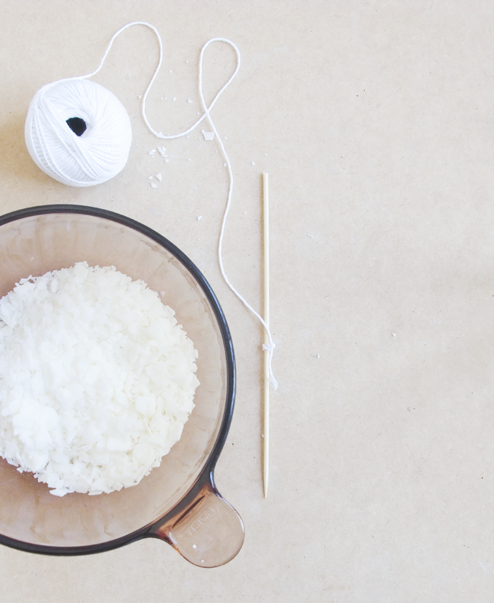 *Podéis comprar la mecha hecha, pero si no tenéis os enseño como prepararla. Atar en un palo (palillos largos, palillos chinos?) un trozo de hilo de algodón grueso. Fundir 250 g de cera de soja, vigilando que esta no supere su temperatura de fusión, sobre los 55ºC, para que no se escarche. Cuando la cera esté fundida, dejar el palo reposando sobre los extremos del recipiente unos segundospara que el cordón se empape bien de cera. Sacar el hilo y dejarlo solidificar en posición vertical, por ejemplo dentro de una botella de agua de plástico vacía.