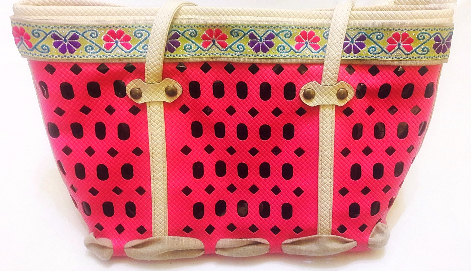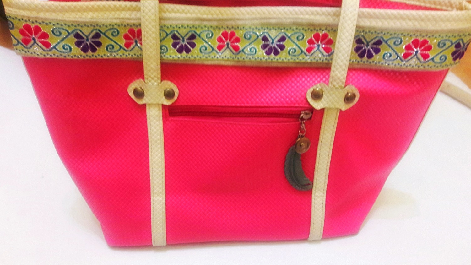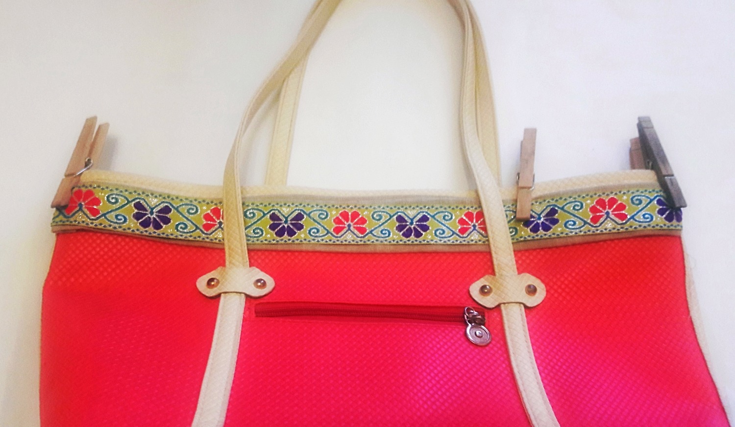Este proyecto no tiene ninguna ciencia solo debemos pegar la cinta crema y la cinta de flores al bolso. Utilicé los pinches para sujetar las cintas mientras secaba el pegamento.