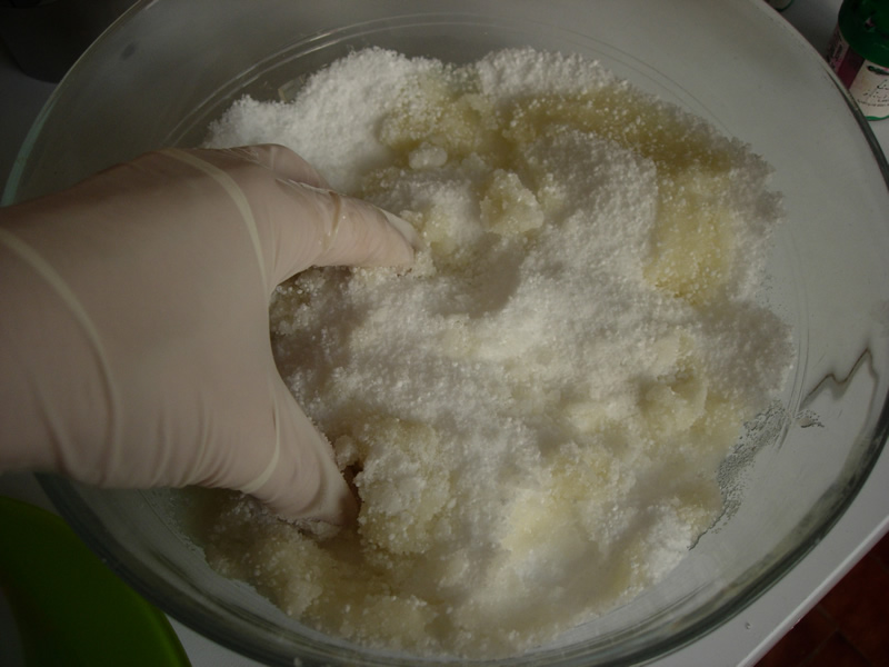 5. Como la mezcla es muy seca y tenemos que conseguir que tenga un tacto mojado (como el de la arena de la playa) le hemos añadido el agua de azahar en vez de agua, que al tener alcohol evita que reaccione y se puede añadir la cantidad que deseemos con total tranquilidad. Hay que darse prisa en este paso porque al poco rato la mezcla endurece y será más complicado añadirlo al molde así.