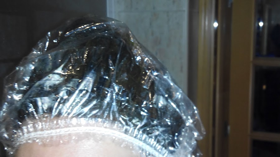 Una vez que ya está todo el cabello bien impregnado de tinte, se debe cubrir con el gorro de plástico que viene en la caja (o en su defecto con film de plástico de cocina). En esta ocasión no me puse ningún pañuelo ni toalla que lo recubriera porque los colores oscuros tampoco tienen la necesidad de tanto calor y porque era pleno agosto (cuando me ponía el rojo incluso aplicaba durante unos minutos el calor del secador).