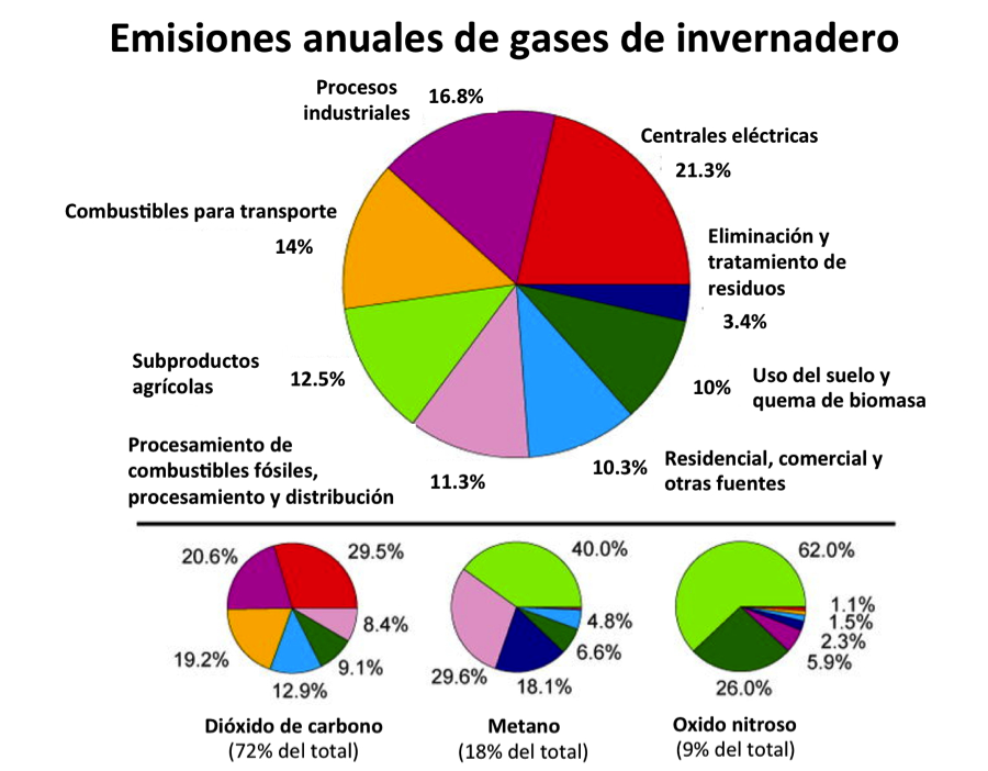 Sin embargo, las actividades humanas de la era industrial han causado un aumento, especialmente en la concentración de CO2 , provocando que más calor quede atrapado en la atmósfera, lo que produce un calentamiento global de la superficie de nuestro planeta.