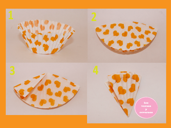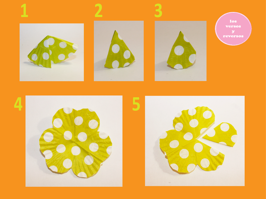 En la foto 1 tenemos los capacillos, luego lo doblas a la mitad como en la foto 2, después -como muestra la foto 3- le haces un doblez, después otro y después otro. Tienes que doblar tres veces para que tengas 8 pétalos en cada flor.