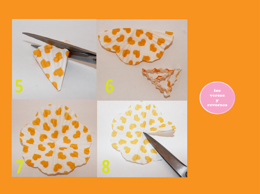 En la foto 5. Corté donde marqué con lápiz, te queda un sobrante como en la foto 6 y extiendes el capacillo como muestra la foto 7 y ya se ve una flor.