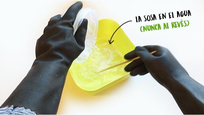 La sosa caustica no debe estar en contacto con piel ni ojos. Hay que trabajar en un sitio bien ventilado para evitar inhalar los vapores que se desprenden. Acá te dejo el vídeo explicando el paso a paso.