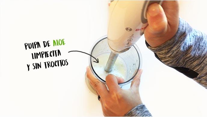 4. Limpia unas pencas de aloe, y pesa 150g (si te pasas un poco no pasa nada). Procesa con la minipimer hasta que quede de consistencia viscosa (sin trocitos).