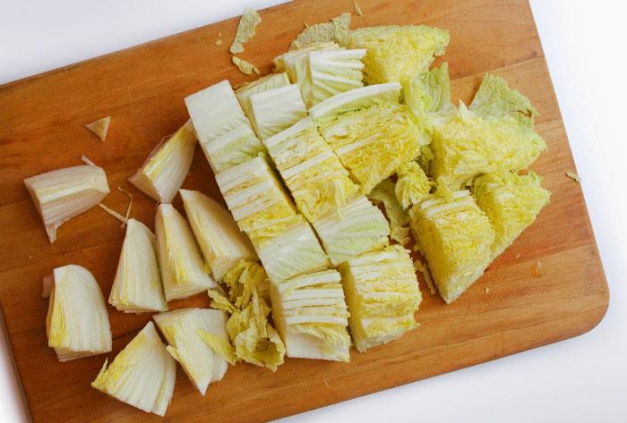 1. Descarta la hojas externa de la col y corta en 4 a lo largo. Luego corta en trozos de unos 2-3 cm aproximadamente.2. Lava la col, escurre el exceso de agua y aplica sal, asegurándote de que caiga por todos lados.