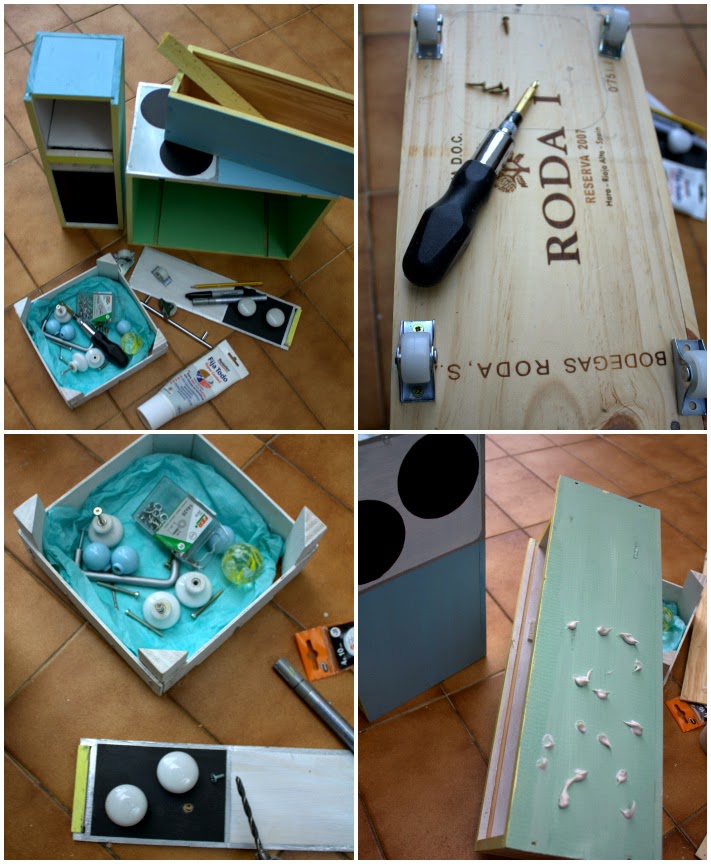 He utilizado cajas de vino vacías que he ido recopilando, no os penséis que me las he bebido todas, aunque no es una mala excusa para hacerlo, la verdad es que cada vez que voy a una cena o comida y veo una, me la pido. También he usado unos pomos que había cambiado de un mueble y un tirador de mi vieja cocina, así como unas ruedas de una cajonera que cambié por patas. Os estaréis dando cuenta de mi afición a guardar cosas, pero es que es curioso que al final suelo acabar utilizándolas. De hecho para este DIY sólo he tenido que comprar un paquetito de tornillos y las cucharitas de madera en los chinos, que he pintado; el resto de las cosas las tenía por casa.
