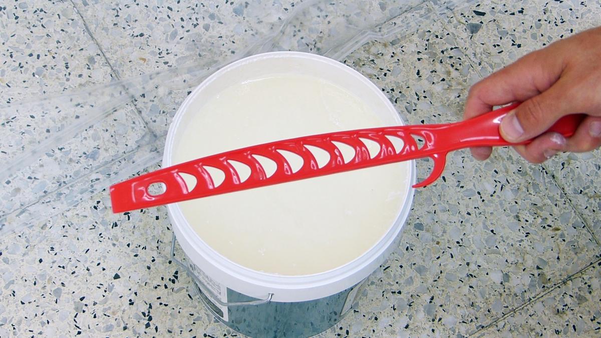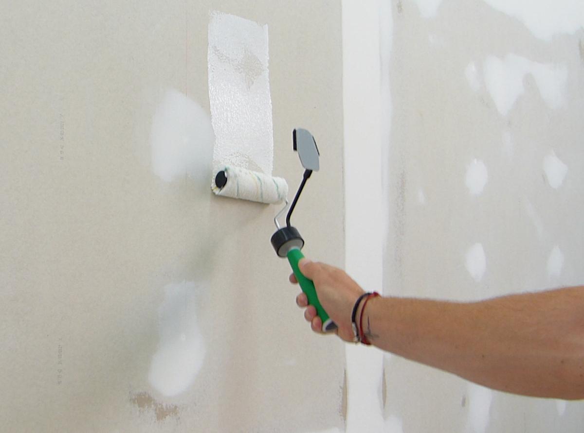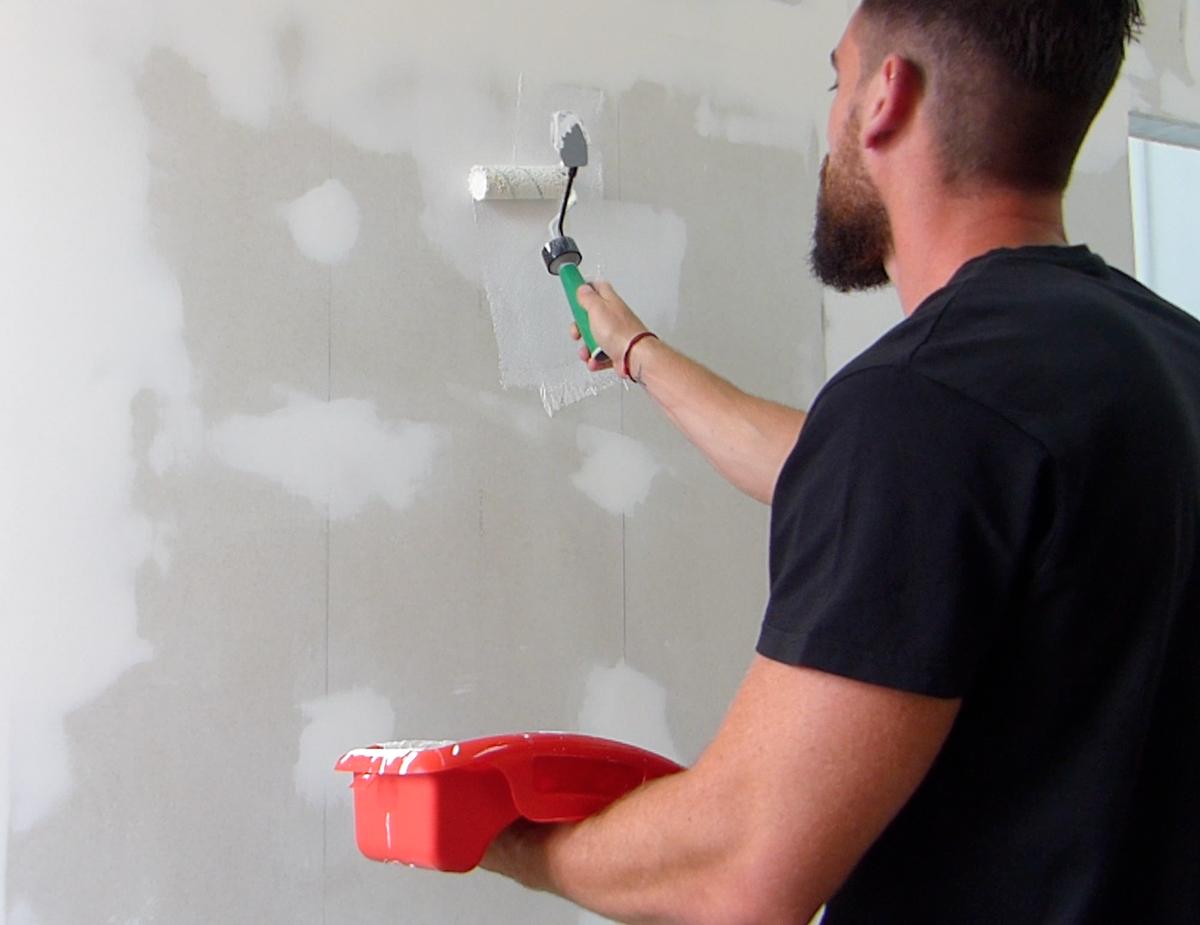 El primer paso es aplicarle una imprimación para que agarre mejor la pintura posteriormente. Lógicamente vamos a utilizar una imprimación específica para pladur. La vamos a aplicar con la cubeta de mano, el rodillo especial para pintar esquinas y necesitaremos el agitador para remover toda la imprimación y dejarla uniforme antes de aplicarla.