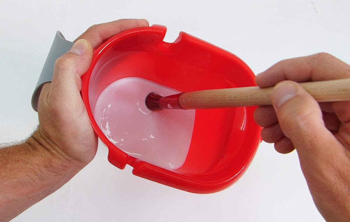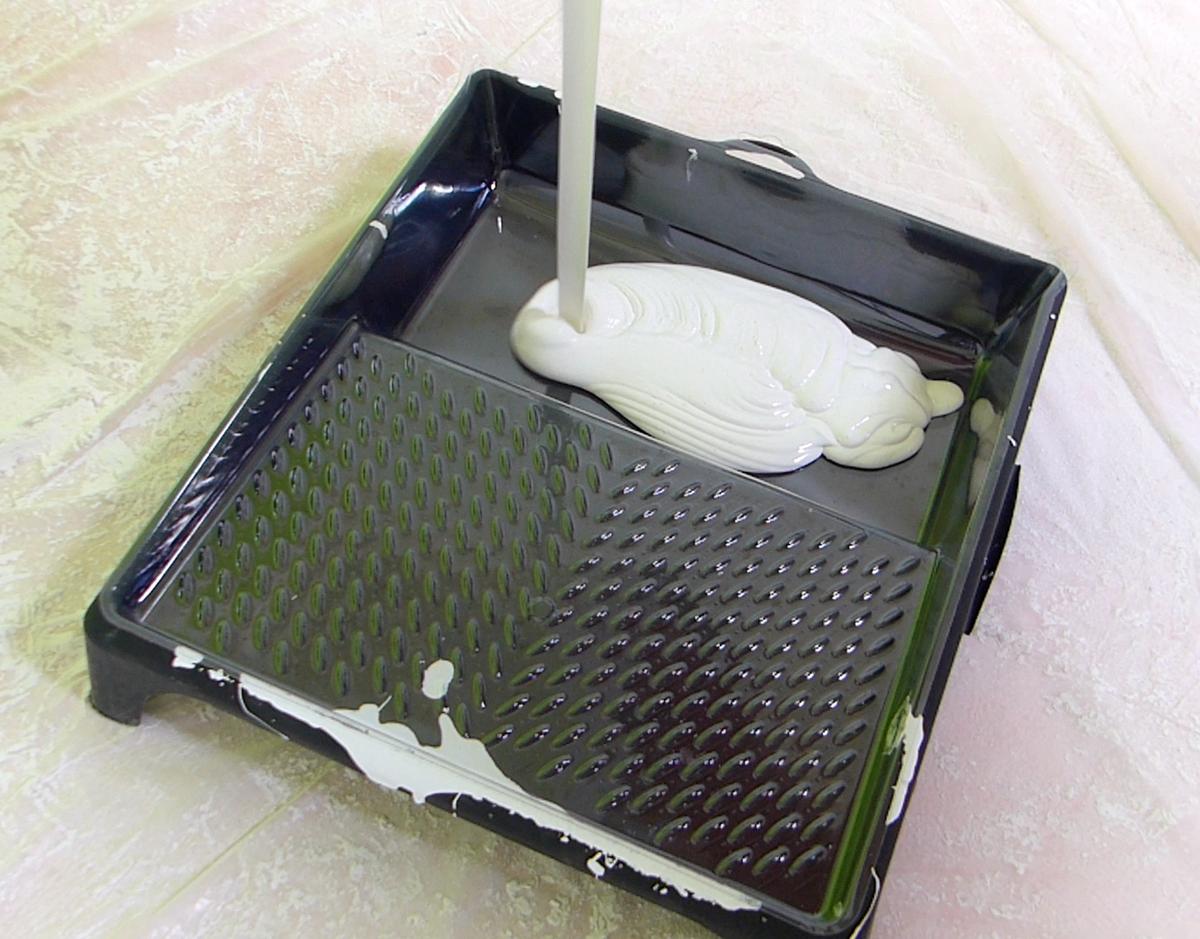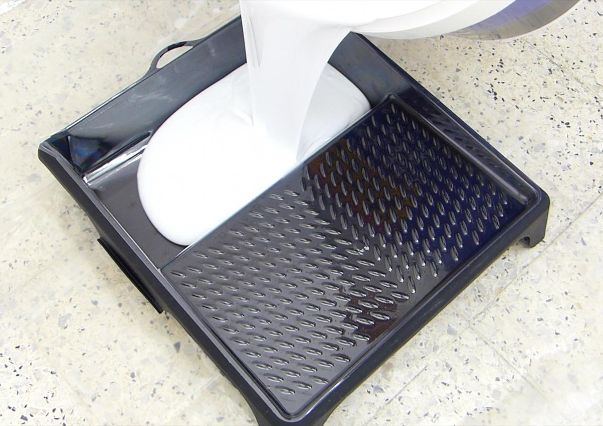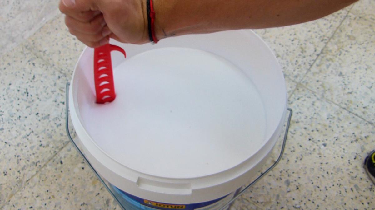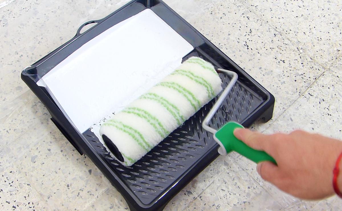 Ahora que he terminado, vierto en una cubeta la pintura y ya puedo impregnar el rodillo para comenzar a pintar. Le he añadido un accesorio de plástico