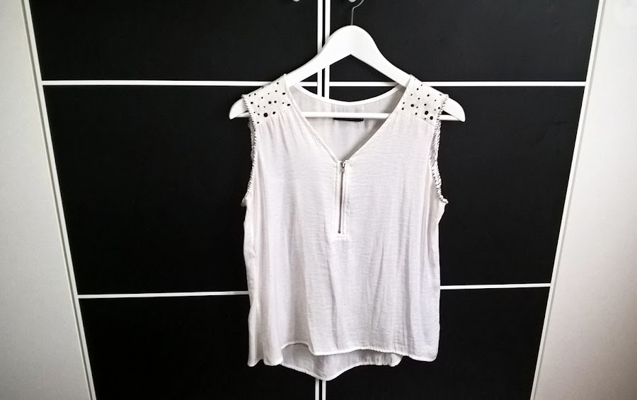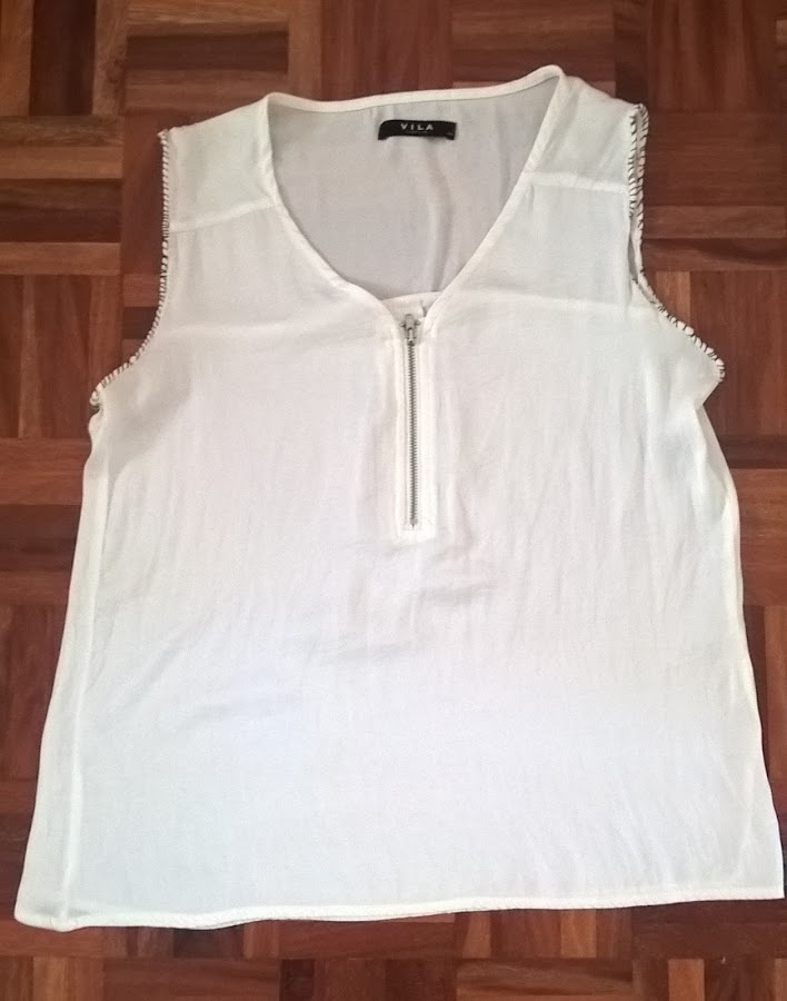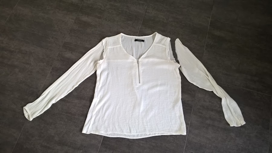La camiseta que queremos reciclar es esta. De color blanco roto, en un tejido similar a la gasa y de manga larga.