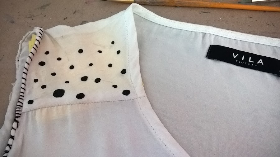 Como cada tela es un mundo, siempre aconsejo hacer una prueba en un trozo de tela (en este caso, he usado las mangas que he recortado). La pintamos, la dejamos secar, y después la lavamos. Si supera con éxito esta prueba, entonces pintamos la camiseta.