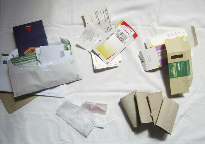 Papel y cartón 134 g, “reciclable” correspondencia, rollitos de papel higiénico, tickets de compra, 2 servilletas, una cajita de jabón, una caja de pastillas, tickets de tren, el cartón de un envoltorio de tacos para pared.