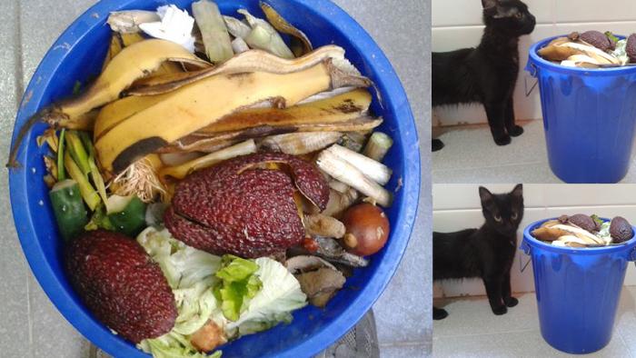 Restos orgánicos, para nuestro compostero pieles de frutas y verduras, huesos de fruta, pelos, uñas, polvo y todo lo que barremos. En todo el mes, llenamos el cubo 6 veces.
