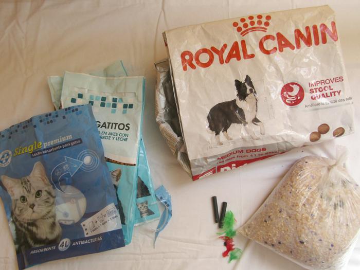 Basura de mascotas 1525 g bolsa de comida (no reciclable) de Nico (mi perro), rollitos de plástico donde vienen las bolsitas para recoger cacas, plumitas de un juguete roto de la gata. Adicionalmente, gastamos en promedio 1,8 bolsas diariamente para recoger las cacas de Nico (las bolsas de comida de la gata ya figuran en la foto de plásticos y fueron pesadas con los residuos plástico y no en este apartado).