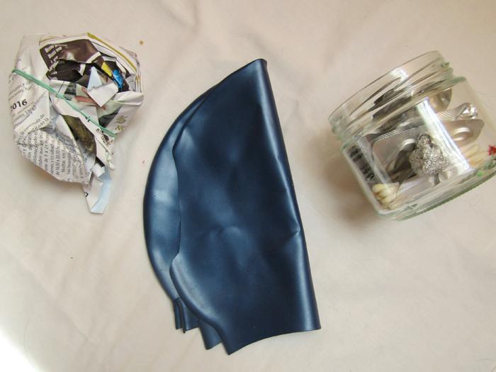 Otros 134 g gorro de natación roto, bote de cristal roto envuelto en papel con una goma. Basura de baño; palitos de oído y blisters de plastillas.