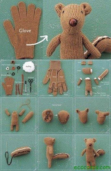 Puedes aprovechar estos recursos, incluso para darle vida útil a aquellas piezas que no podemos utilizar como los calcetines o los guantes solitarios, cuya pareja se ha marchado de sus vidas sin dejar rastro ni despedirse… A continuación te compartimos una imagen con el tutorial para crear una ardilla a partir de un guante, una propuesta entretenida para realizar un regalo diferente mientras podemos reciclar ropa.