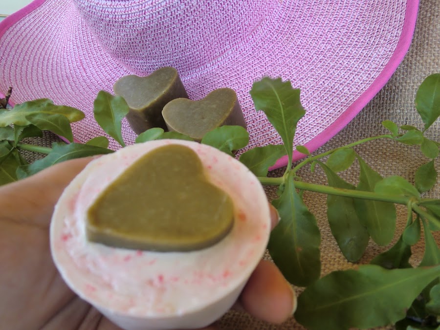 Este fue el primero de esta serie de jabones elaborados en agosto porque fue el que más claro tenía que no podía faltar. Lo imaginé incrustado en un jabón redondo con chispas de jabón color rosa y así resultó. En la foto no sale bien pero seguro que mojado resaltarán las chispas color rosa y será mucho más bonito.