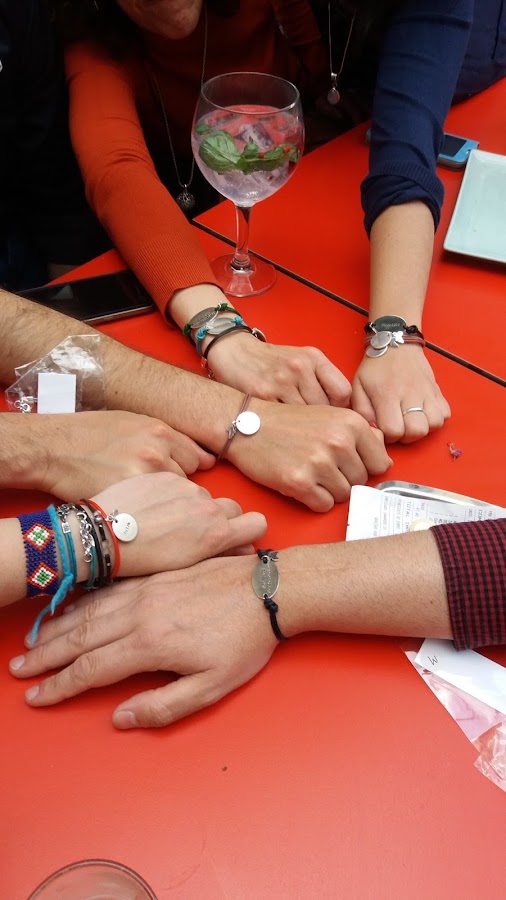 Amigos que compartimos un sentimiento común. Amigos que disfrutamos ayudando. Amigos que nos emocionamos solo con ver a nuestros niños y niñas en una pantalla de televisión, y comprobar cómo es una clase; o a unas mujeres, vestidas con sus mejores galas, dando las gracias a través de cánticos y de bailes. Amigos que disfrutan de la compañía mutua. Y ahora, amigos que comparten unas bonitas pulseras solidarias como símbolos de un proyecto maravilloso que nos ha unido.