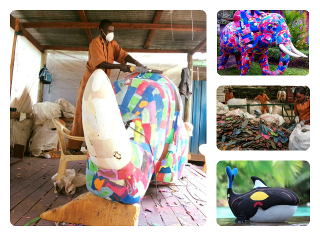 Te imaginas cuantas ojotas de goma tiramos a la basura en un año? No tengo la mas mínima idea pero debe ser un numero mas alto del que imaginamos como también es alta la cantidad de años que le lleva a nuestro planeta degradar ese tipo de materiales. La empresa social Ocean Sole tiene como objetivo reciclar y darle nuevo valor a desechos marinos de plástico y caucho y por medio de los fondos obtenidos educar a favor del medio ambiente. Esta empresa keniana trabaja con otras empresas, comunidades, científicos, conservacionistas, artistas, gobiernos, industrias y otras organizaciones sin fines de lucro para apoyar acciones que reduzcan, reutilicen y reciclen, desechos marinos y fluviales. De esta manera convierten 50 toneladas anuales de ojotas que son arrastradas por las corrientes marinas a las playas de áfrica oriental en esculturas, mediante un trabajo manual y totalmente artesanal. Los artesanos convierten toda esta basura en elefantes, jirafas, leones, rinocerontes, delfines, tiburones, tortugas entre otros.