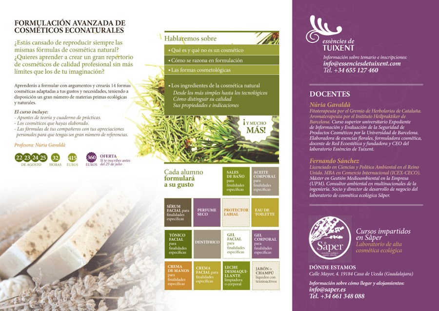 Para los apasionados de la cosmética natural artesanal, desde Saper, este año, vuelven a colaborar con Núria Gavaldá de Essencies de Tuixent en la organización de dos cursos, uno "Cómo abrir tu propio laboratorio cosmético" y otro de "Formulación en cosmética econatural".
