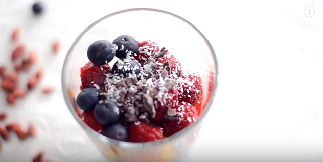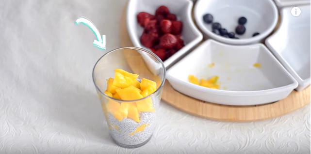 4. Ahora, ¡solo queda combinar los ingredientes! En un vaso, intercalamos capas de chía con capas de fruta hasta llenarlo por completo.