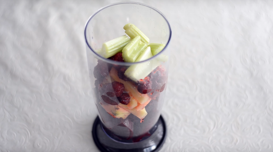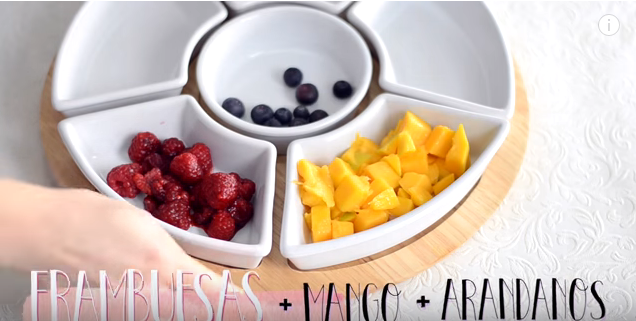 3. A continuación, cortamos todas las piezas de fruta. Podéis utilizar, por ejemplo, frambuesas, mangos y arándanos.