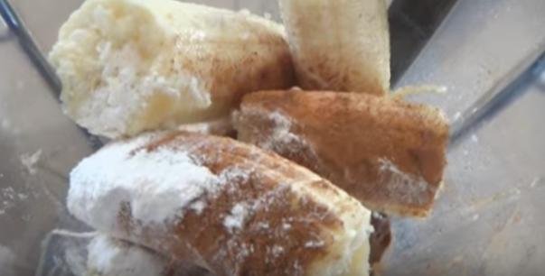 2. Limpiamos la licuadora y echamos: 3 plátanos(pelados), 1 taza de dátiles (limpios), 1 cucharada de canela, 1 cucharada de polvo para hornear y 1/2 de leche de soja.