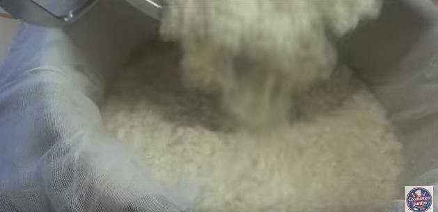 12. En un molde que tenga agujeros vamos a colocar dos trozos de tela para colar y vamos a darle forma a nuestro tofu.