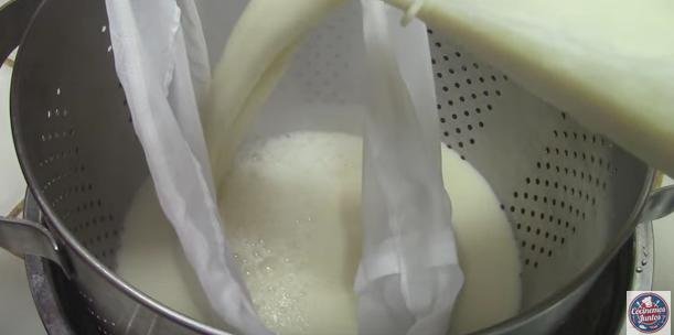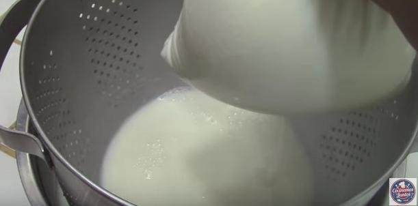 6. Colocaremos una tela para escurrir la leche sobre un colador que colaremos sobre un recipiente. Es decir: tela, colador y recipiente.