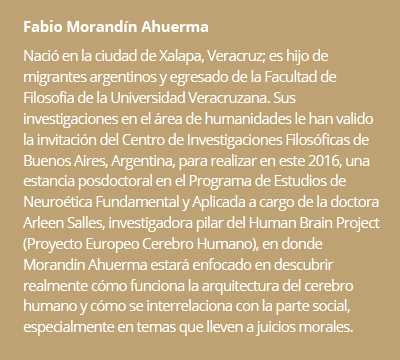 Este proyecto que vio la luz durante el doctorado que hizo Morandín Ahuerma, en el Instituto de Filosofía de la Universidad Veracruzana dentro del Programa Nacional de Posgrados de Calidad (PNPC) del Consejo Nacional de Ciencia y Tecnología (Conacyt), lo ha llevado a investigar cuáles son los mecanismos en la arquitectura del cerebro para la toma en las decisiones morales.