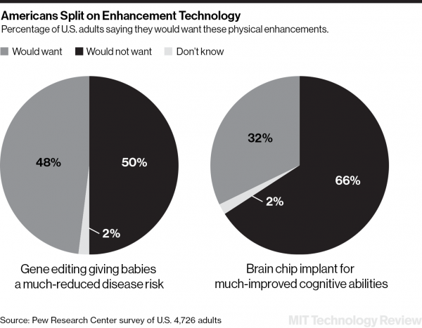 El veredicto fue negativo en general. Más del 60% de los encuestados afirmaron sentirse algo o muy preocupados acerca de estas nuevas tecnologías, y en la misma medida dijeron que no querrían aplicar estas mejoras ni a su sangre ni a su cerebro. La opinión estaba dividida a partes iguales sobre la posibilidad de mejorar el ADN de los niños, con un 50% que se opuso y un 48% que afirmó estar dispuesto a hacerlo. Esto sea posiblemente porque la pregunta sugería que la tecnología sería empleada para curar enfermedades, no para mejorar a un niño ya sano.