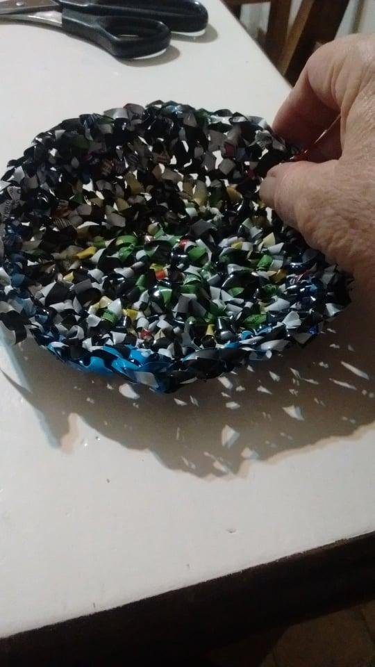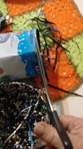 Bien para comenzar con la tarea de hoy es necesario que tengamos varios sachets limpios y secos y les cortemos ambos extremos(una tira fina) no desperdiciemos, luego, colocando una mano por dentro para facilitar la tarea, vamos cortando en toda su circunferencia, como en espiral, siguiendo siempre en lo posible el mismo ancho, luego lo ovillamos como si fuera lana o hilo.