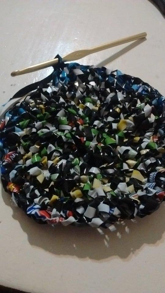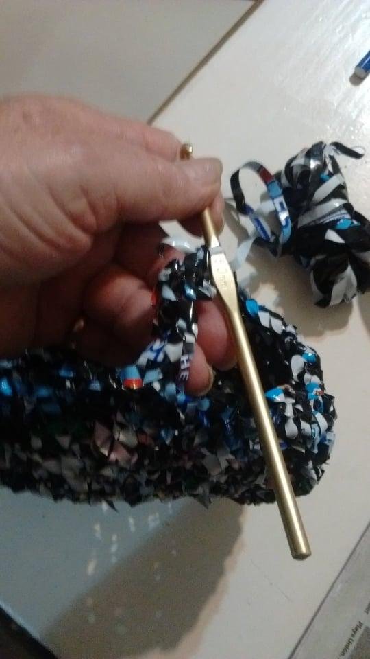 Una vez obtenido el material comenzamos a tejer con aguja de crochet numero 6 (gruesa) la primera vuelta, en circulo, en medio punto, luego continuamos con vareta, haciendo un circulo de base que va a tener el diámetro de acuerdo al tamaño que queramos hacer nuestra bolsa, no olvidemos tejer dos baretas agujero por medio para que no se nos cierre el tejido. Una vez conseguido el tamaño deseado, seguimos tejiendo derecho sin aumentos hasta la altura que creemos conveniente. Las manijas las tejemos partiendo del la ultima vuelta haciendo tantas cadenas como sea necesario para su largo, la unimos en el otro extremo, siempre tejiendo i lo reforzamos con una o dos vueltas de medio punto. Queda fuerte y colorida y será una forma de no usar las bolsas plásticas del súper. Espero que les guste la idea y la voten. Hasta la próxima.