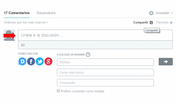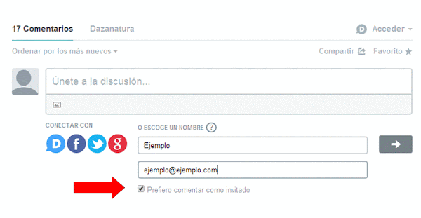 También podéis comentar como invitados, es decir sin necesidad de registro ni utilizar ninguna otra red. Clickais en Prefiero comentar como invitado (os pide un nombre y un email aunque este email no me consta a mí en ningún lado, es por el spam):