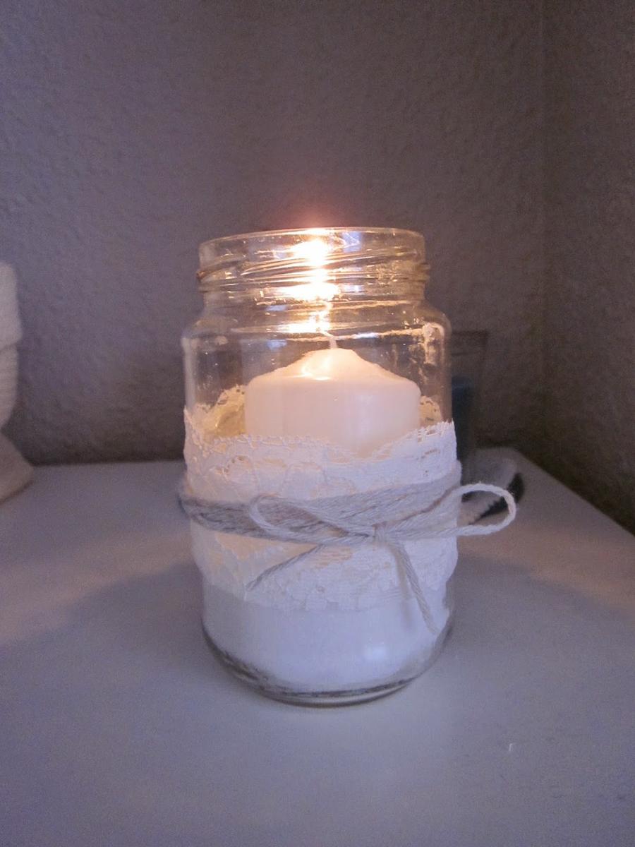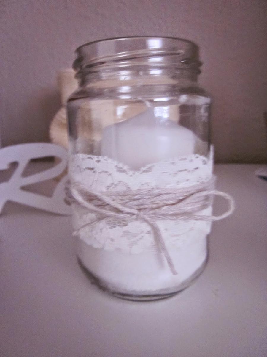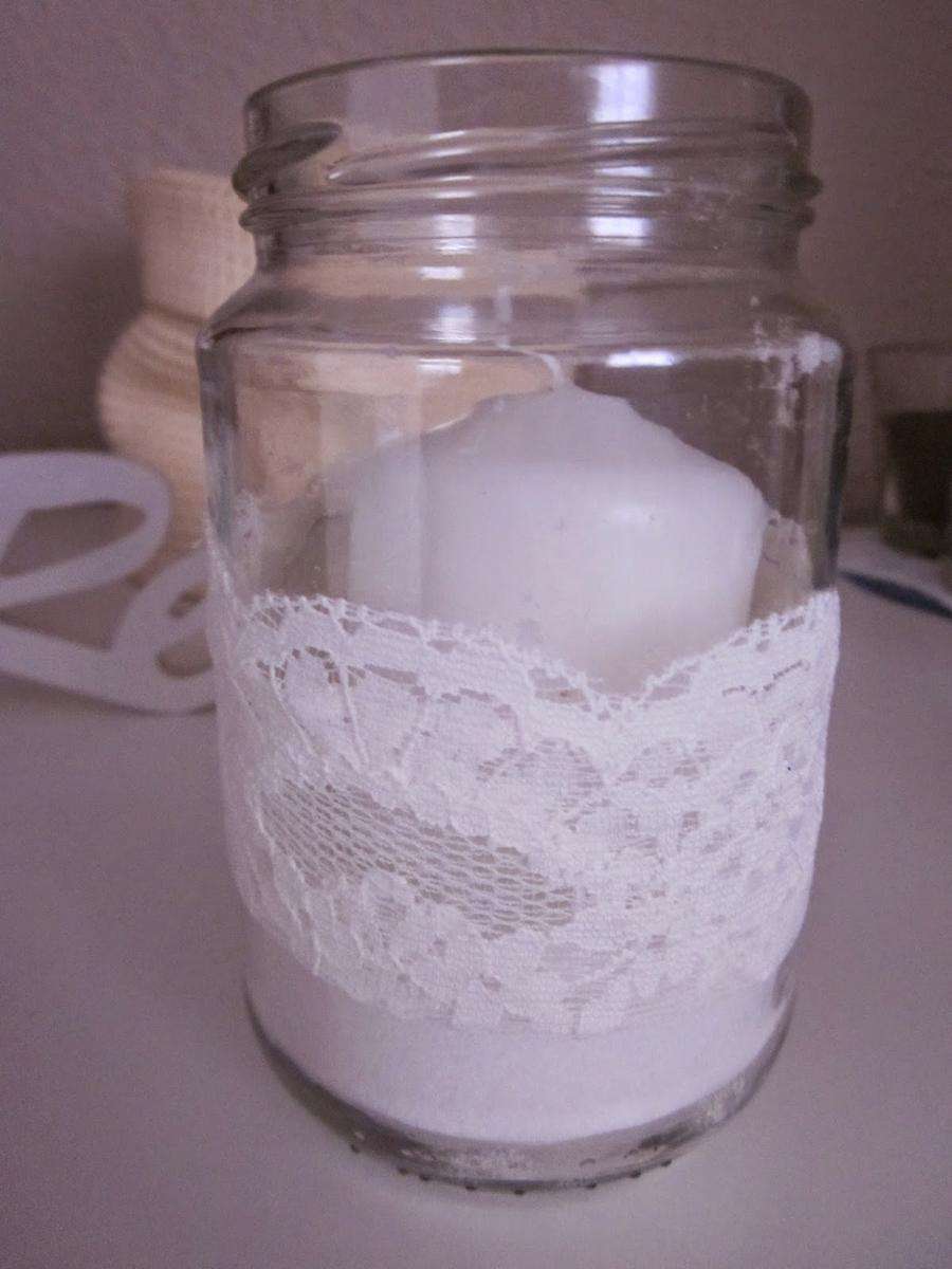 A continuación, decoramos el tarro rodeándolo de encaje que pegaremos al cristal con silicona caliente o pegamento, sólo en los extremos