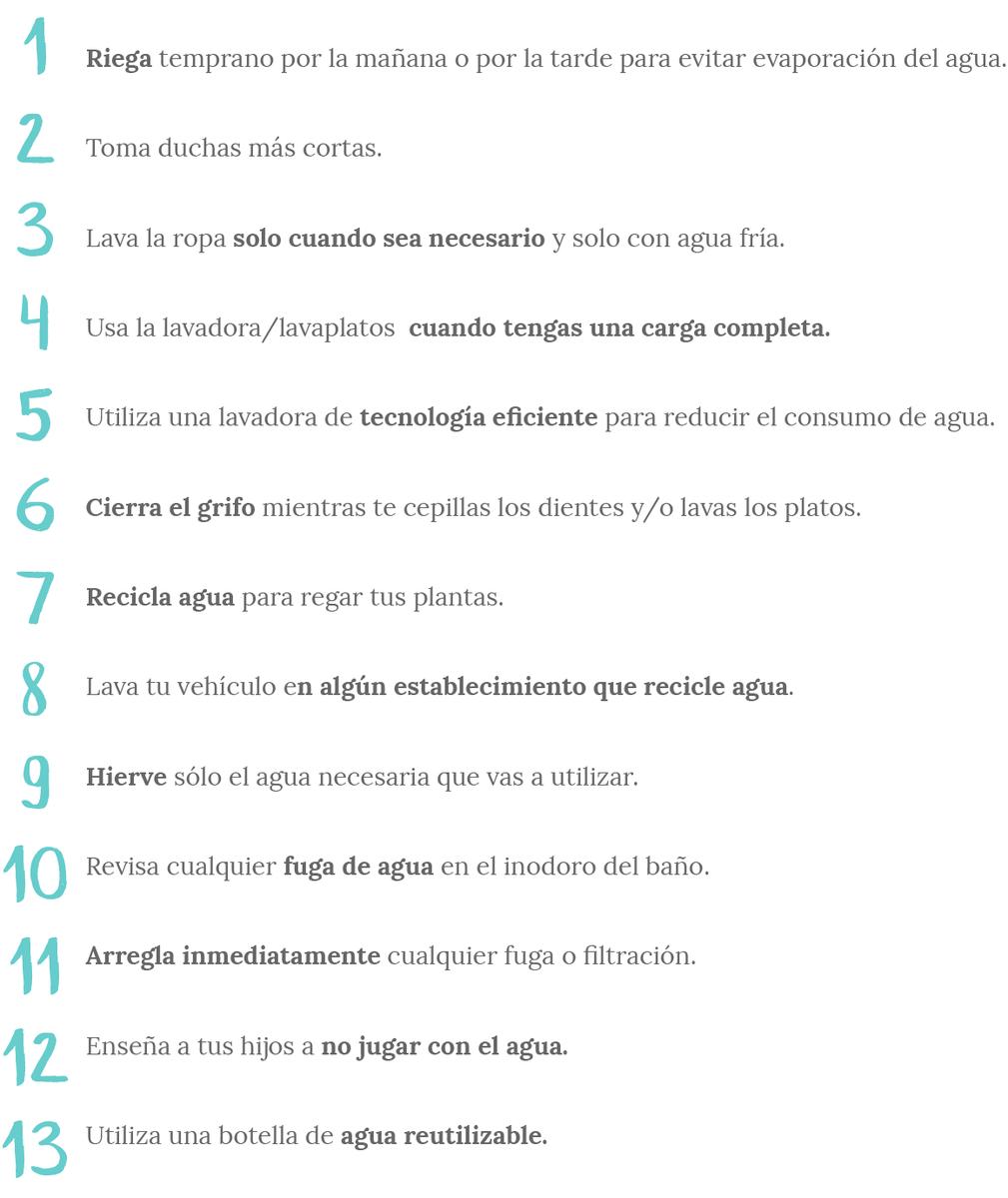 Aunque el problema sea grande y las soluciones complejas siempre hay algo que podamos hacer. Como siempre digo, poner nuestro granito de arena y más si -como yo- eres un ser humano privilegiado con acceso libre al agua potable. He recopilado una lista de tips que fácilmente podemos aplicar para cuidar de esta fuente de vida.