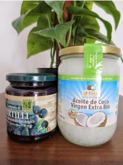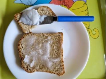 ¿Con qué pensáis que unto mis tostadas? ¿Con mantequilla, con margarina? Pues ni con la una, ni con la otra. Las cubro con una buena capa de aceite de coco virgen orgánico y un poco de mermelada sin azúcares añadidos (de la marca Natura in festa o de la Finestra sul cielo).