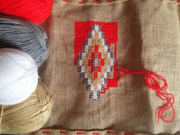 En estos días he empezado un proyecto que, poco a poco y como método de relax, pretendo llevar a cabo. Se trata de un punto de cruz con lana en tela de saco, el diseño me lo estoy inventando a medida que lo voy haciendo a partir de un motivo navajo. Es un cojín para para la terraza, quiero tenerlo listo para cuando empiece la temporada de verano. ¡Voy a tener que ponerme las pilas!.