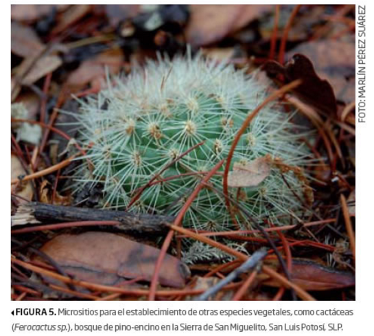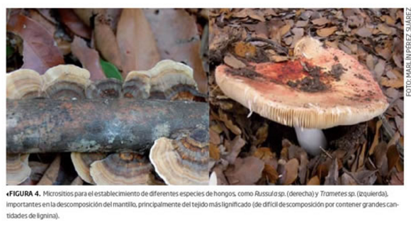Ejemplos de estos organismos son hongos (figura 4), algas, bacterias (microflora) e invertebrados (ácaros, termitas, coleópteros, hormigas, ciempiés…); además de plántulas de distintas especies vegetales (figura 5), cuya emergencia, establecimiento y sobrevivencia depende de los recursos —humedad, luz y otras condiciones microambientales— aportados por el mantillo.