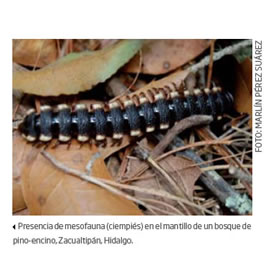 El mantillo es, por sí mismo, reflejo de la biodiversidad en un ecosistema forestal; en tal sentido, el número e identidad de las especies arbóreas, arbustivas y pastos presentes en un bosque determinan la variedad física y química del tejido vegetal que compone el mantillo. Estas características controlan el arreglo espacial de los componentes del mantillo al caer al suelo, así como la cantidad de agua que el mantillo puede absorber y su velocidad de degradación, todo lo cual influye en la diversidad de organismos para los que el mantillo es la principal fuente de sustento, por ofrecer materia, energía y hábitat (figura 4).
