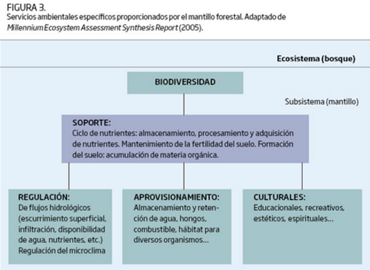 Un ecosistema es un conjunto complejo formado por subsistemas de menores dimensiones. En los bosques, el mantillo forestal es considerado uno de los subsistemas de mayor complejidad (figura 3), porque funciona como una interfase que conecta el suelo y la atmósfera y, como tal, el mantillo tiene múltiples funciones que originan diversos servicios ecosistémicos o ambientales. Las funciones ecológicas abarcan todos aquellos procesos físicos, químicos y biológicos que se llevan a cabo entre los organismos y su ambiente.