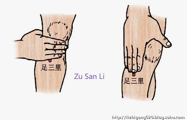 Es llamado Zu San Li y está situado bajo la rodilla a la altura de los dedos meñique y anular (imagen) allí encontraras un pozuelo o hendidura que te darás cuenta inmediatamente ya que en ocasiones se siente dolor o entumecimiento. Masajéalo hacia derecha he izquierda confianzudamente. Créeme es barato sencillo no tiene contraindicación y es beneficioso para la salud. Elimina la fatiga retrasa el envejecimiento, mejora la memoria, fortalece la audición y la vista y si quieres mas bondades, las hay descúbrelo tu mismo.